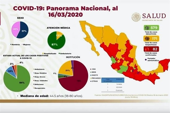 Hasta este lunes 16 de marzo se han reportado 82 casos confirmados de Covid-19 en el país, lo que representa un aumento de 29 casos en las últimas 24 horas, informaron funcionarios de la Secretaría de Salud.