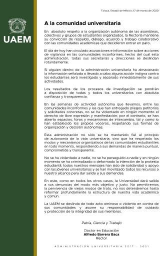 “Las jóvenes han construido un nuevo pacto, transparente y claro, han fortalecido a nuestra comunidad en la demanda de una universidad segura y libre de violencia contra las mujeres, y ésta, y no otra, es y será nuestra prioridad; ninguna fuerza política ajena empañará esta urgencia”.
