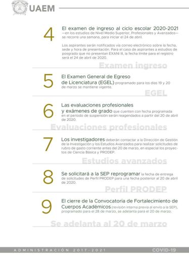 Cabe resaltar que este miércoles, y en la víspera del anticipo de las vacaciones de Semana Santa por la emergencia sanitaria, la UAEM también publicó el almanaque escolar para el periodo regular Primavera 2020 A.
