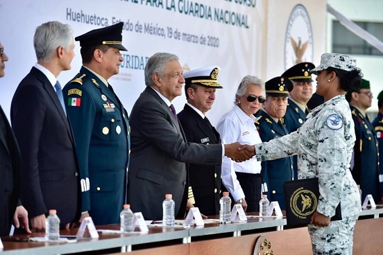 En el campo militar 37-C San Miguel de los Jagüeyes, ubicado en el Estado de México, López Obrador realizó la entrega simbólica de dos mil 740 elementos, de los cuales 410 son mujeres, quienes concluyeron la capacitación durante cinco meses, el primer paso para formar parte de la Guardia Nacional.