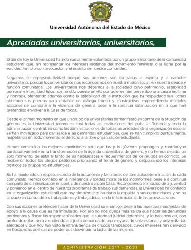 Dado que éste día fueron dañados por un grupo de alumnos los edificios de Rectoría y administrativo. La Universidad Autónoma del Estado de México por medio de un pronunciamiento informa que harán las denuncias pertinentes para fincar responsabilidades que la autoridad judicial determine.