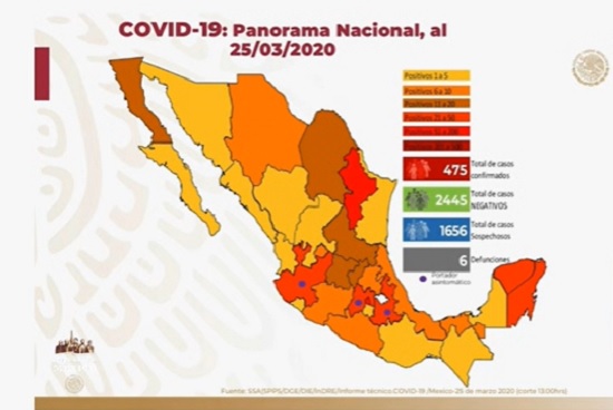 Este miércoles ocurrió otra muerte a causa del COVID-19 en el país, con lo cual suman seis fallecimientos. Además se tienen 475 casos confirmados del virus, informó el subsecretario de Prevención y Promoción de la Salud, Hugo López Gatell.