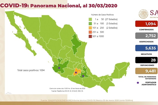 Autoridades de la Secretaría de Salud federal (Ssa) informaron en conferencia de prensa que el número de casos confirmados de la nueva cepa de coronavirus Covid-19 aumentó a 1,094 en México.