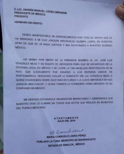 “Nuestros abogados José Luis González Meza y Juan Pablo Bandillo están en contacto directo con quienes usted designó para la repatriación de mi querido hijo, Joaquín Archivaldo Guzmán Loera, es decir los secretarios de Gobernación, Relaciones Exteriores, Secretaría de Hacienda y la Fiscalía General de la República en donde ya se aportaron todas las pruebas, en donde queda claro que mi hijo fue entregado ilegalmente al gobierno de los Estados Unidos de Norteamérica».