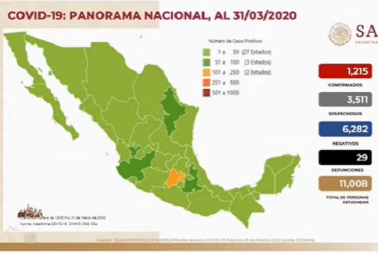 En México, hasta este martes, se han confirmado mil 215 casos de COVID-19 y 29 defunciones. Hay tres estados que son los más afectados, informó el titular de la Dirección General de Epidemiología, José Luis Alomía Zegarra.