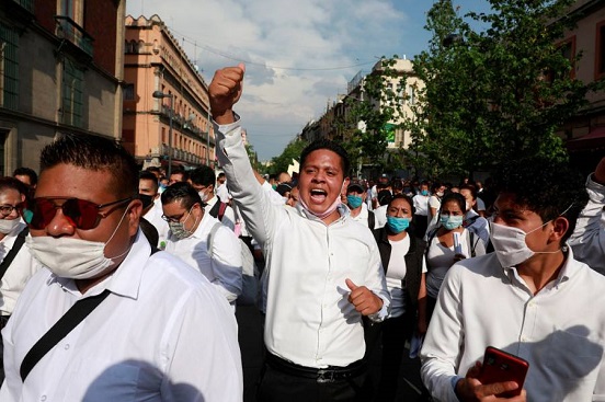 Vestidos de blanco y negro la mayoría, y algunos con tapabocas, hombres y mujeres, trabajadores de restaurantes, cafeterías y empresas de banquetes, exigieron desde el pasado viernes algún préstamo o entrega directa de recursos, tras ya no recibir ningún ingreso desde unos días porque viven al día.