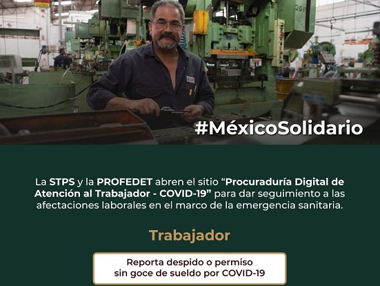 A través del sitio https://procuraduriadigital.stps.gob.mx/ se reforzará la atención de los reportes de afectación laboral presentados por los trabajadores que se encuentren en situación de despido o permiso sin goce de sueldo, supuestos que son injustificables a través de la declaración de emergencia sanitaria a causa del COVID-19.