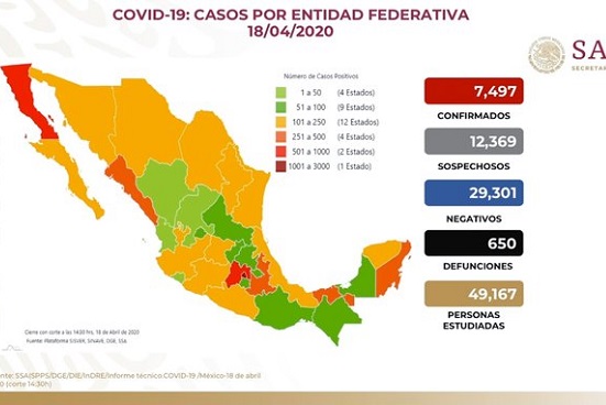 En México hasta este sábado se registraron siete mil 497 casos de COVID-19 y 650 defunciones, informó el subsecretario de Salud y Prevención, Hugo López-Gatell.