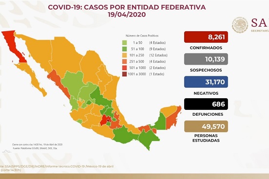 Hasta este domingo, suman en el país ocho mil 261 casos confirmados de COVID-19 y 686 fallecimientos. Desde el inicio de la epidemia un total de 49 mil 570 personas han sido estudiadas, informó el subsecretario de Prevención y Promoción de la Salud, Hugo López-Gatell.