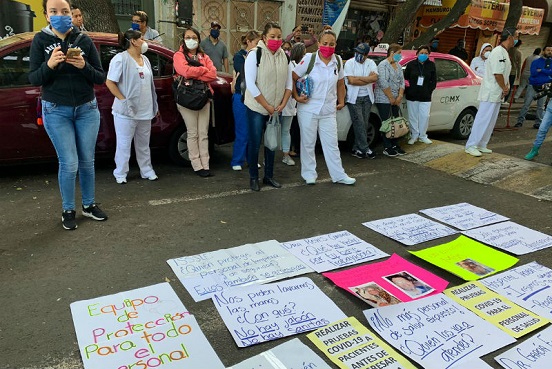 «El personal de salud está en la guerra y sin armas», «¿quién protege al personal de limpieza y de seguridad?, ellos también se arriesgan», «realizar pruebas COVID-19 para el personal de salud», «nos piden lavarnos las manos ¿con qué?, no hay jabón», denuncian en cartulinas los manifestantes.