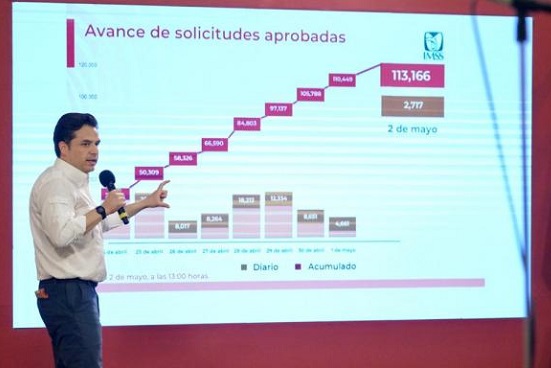 El director general del Instituto Mexicano del Seguro Social (IMSS), Zoé Robledo, informó que del 24 de abril al 2 de mayo, 113 mil 166 empresarios solidarios han sido aprobadas para recibir un Crédito Solidario a la Palabra por 25 mil pesos, como reconocimiento a que en el primer trimestre del año y en plena emergencia sanitaria no redujeron su plantilla laboral.
