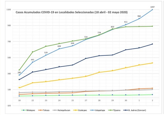 Cabe destacar que las acciones del ayuntamiento para prevenir la expansión de la pandemia están vigentes con un ejército de servidores públicos que realizan labores esenciales con equipo especializado. Fuente: Sistema de información Geográfica de la Universidad Nacional Autónoma de México, UNAM.