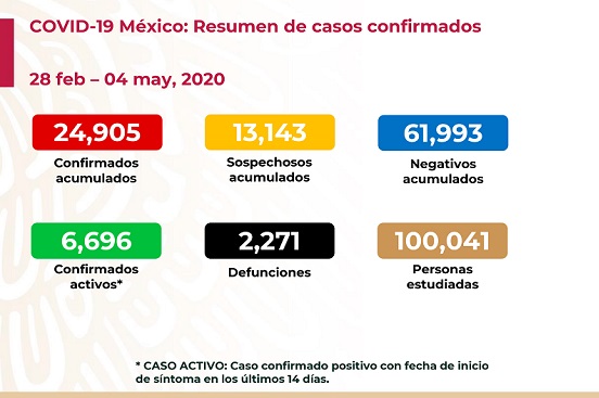 México suma hasta este lunes 24 mil 905 casos confirmados de COVID-19, de los cuales seis mil 696 se mantiene activos, y dos mil 271 defunciones, informó el titular de la Dirección General de Epidemiología, José Luis Alomía Zegarra.