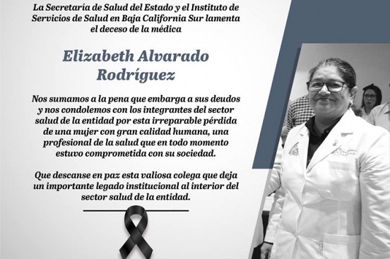 La subdirectora de Atención Médica Ambulatoria de la Secretaría de Salud en Baja California Sur, Elizabeth Alvarado Rodríguez, murió la víspera a causa del COVID-19, informaron autoridades estatales.