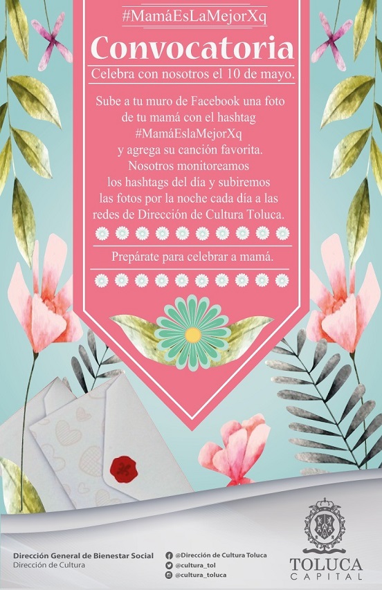 La Dirección de Cultura de Toluca prepara una dinámica para dar a las madres una serenata online el 10 de mayo de 10:00 a 21:00 horas, a través de las redes sociales del Ayuntamiento, y para conocer el repertorio que las toluqueñas quieren escuchar invita a la población a subir a su muro de Facebook una foto con la festejada, con el hashtag #MamáEsLaMejorXq y agregar su canción favorita.