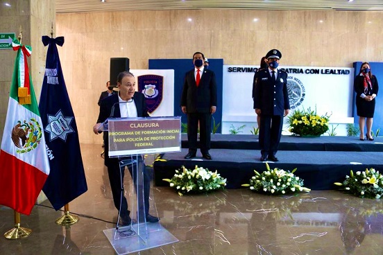 «Les ordeno desempeñarse con estricto apego a la ley, con absoluto respeto a los Derechos Humanos y con máxima actitud de servicio a nuestras instituciones, siempre bajo los principios de honor y de justicia, de lealtad y patriotismo, sean buenos policías, vayan a cumplir su deber», dijo.