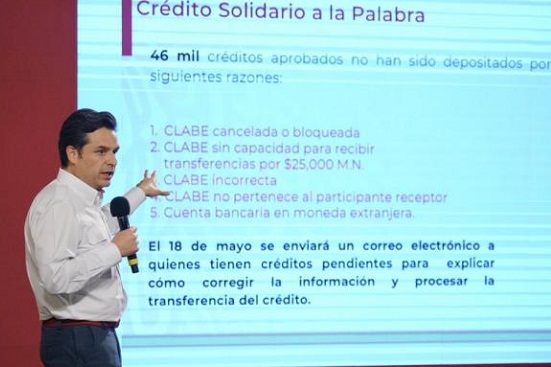 Comentó que hay 46 mil créditos aprobados que no han recibido el depósito en las cuentas bancarias, entre otras razones porque la cuenta CLABE puede estar cancelada o bloqueada, sin capacidad para recibir transferencias por 25 mil pesos, es incorrecta o no pertenece al participante receptor.