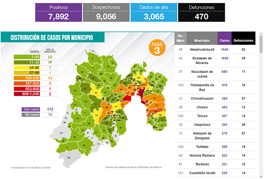 También dio a conocer que 470 personas han perdido la vida en territorio mexiquense y 229 fuera de él; mientras que nueve mil 56 casos esperan los resultados de la pruebas y ocho mil 834 personas han dado negativo al contagio de este padecimiento.