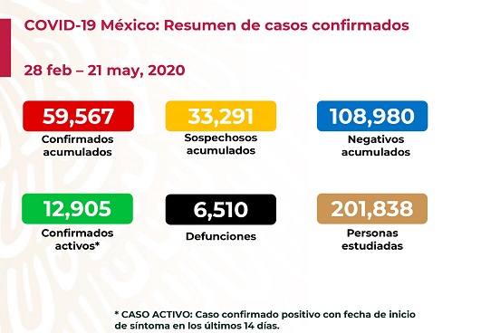 En las últimas 24 horas el país ha registrado dos mil 973 casos de COVID-19, con lo que hasta este jueves suman 59 mil 567 personas contagiadas y seis mil 510 defunciones, informó el subsecretario de Prevención y Promoción de la Salud, Hugo López-Gatell.