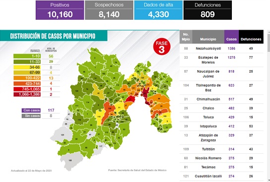 Suma Edoméx 10,160 casos positivos a Covid-19 y 809 defunciones