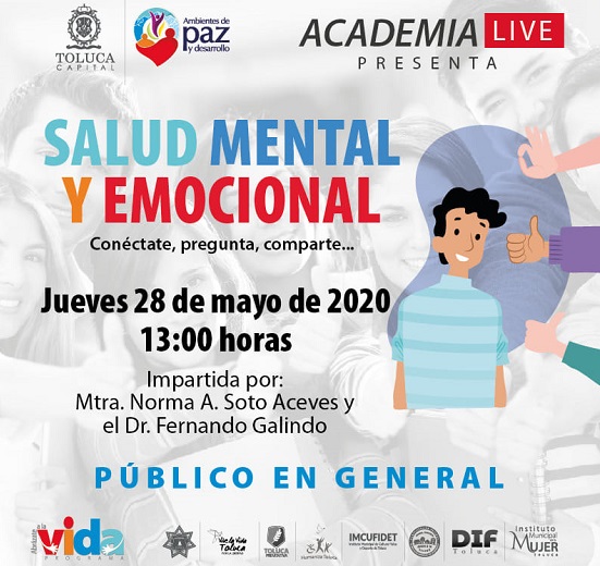 Por esta razón, se invita a los toluqueños a sumarse a la conferencia virtual “Salud mental y emocional. Conéctate, pregunta y comparte”, que se transmitirá el jueves 28 de mayo a las 13:00 horas a través del Facebook Academia de Policía Toluca, la cual será impartida por la coordinadora del programa Ambientes de Paz y Desarrollo, Norma Alicia Soto Aceves, y el director de Prevención Comunitaria de la Dirección General de Seguridad Pública, Fernando Galindo Cruz.