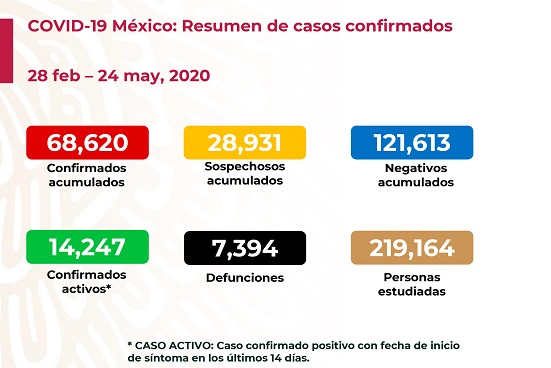 México registra hasta este domingo 68 mil 620 casos confirmados de COVID-19, de los cuales 14 mil 247 se encuentran activos, y siete mil 394 defunciones, informó el titular de la Dirección General de Epidemiología, José Luis Alomía Zegarra.