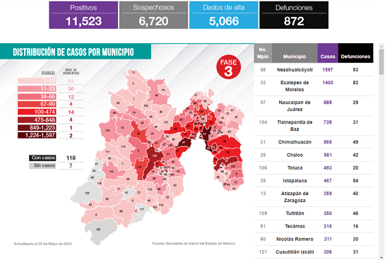 Edoméx suma 11,523 casos de Covid-19 y 872 fallecimientos