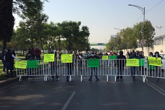 Un grupo de expolicías federales que se niegan a sumarse a la Guardia Nacional realizan un bloqueo en Periférico Oriente, a la altura de Avenida Canal de San Juan, para exigir a las autoridades pagos atrasados.