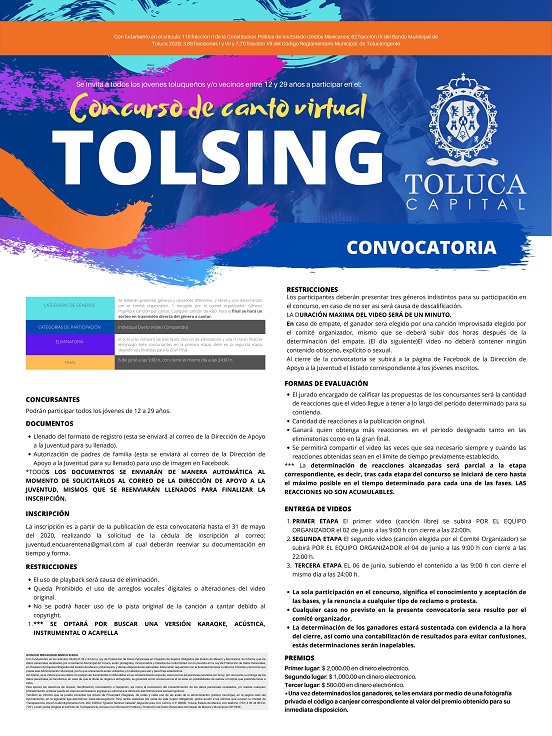 La Dirección de Apoyo a la Juventud de Toluca invita a los jóvenes de 12 a 29 años a participar en el concurso de canto virtual Tolsing. La inscripción estará abierta hasta el 31 de mayo. El primer lugar recibirá un premio dos mil pesos en dinero electrónico, el segundo lugar, mil, y el tercero, 500.