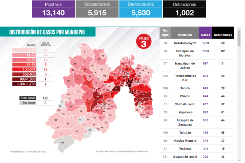 Edoméx suma 13,140 casos Covid-19 y 1,002 defunciones