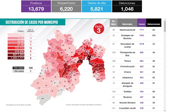 Edoméx suma 13,679 casos positivos a Covid-19 y 1,046 fallecidos