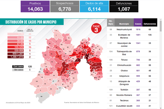 Edoméx suma 14,063 casos Covid-19; 1,087 defunciones y 6,114 recuperados
