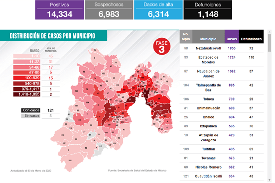 Edoméx suma 14,334 casos Covid-19 y 1,148 defunciones