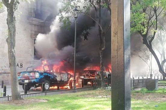 Después de graffitear los vehículos, un grupo de manifestantes les prendieron fuego y sacaron un arma larga que abandonaron en el piso. Durante algunos minutos se escucharon explosiones provenientes de las patrullas y los manifestantes se dispersaron en Plaza Liberación, detrás de la Catedral de Guadalajara.