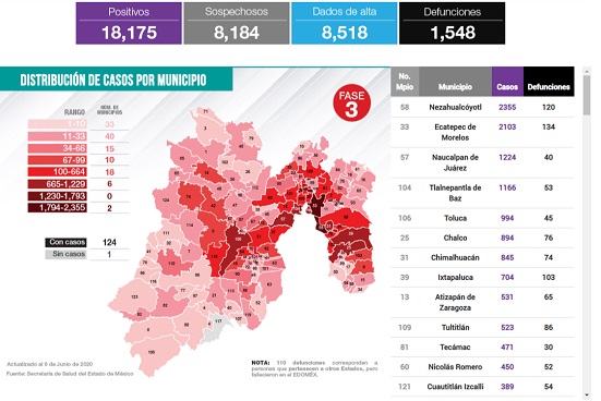 Edoméx suma 18,175 casos Covid-19 y 1,548 defunciones