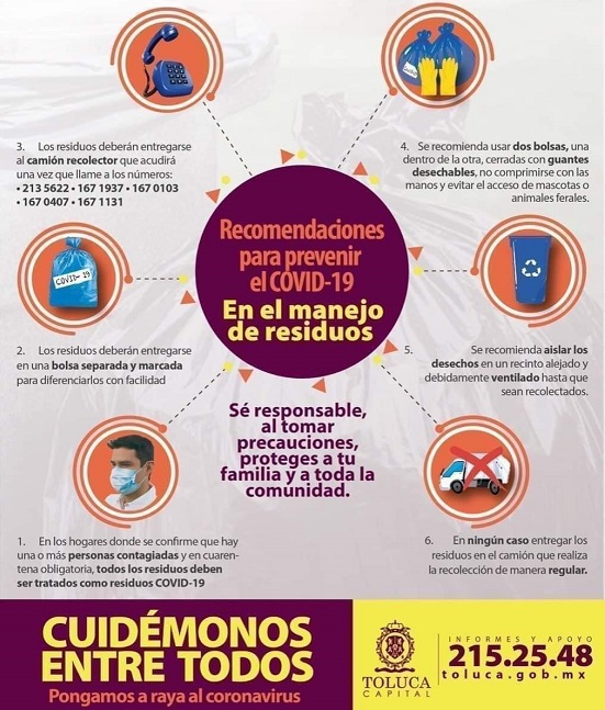 Para ello, deberán utilizarse guantes desechables sin comprimir la bolsa, mantenerla alejada de animales que puedan romperlas y esparcir el contenido infectado, identificarlas con la leyenda COVID-19, llamar a los números telefónicos 722 1 67 01 03, 722 1 67 04 07, 722 1 67 11 31, 722 1 67 19 37 y 722 2 13 56 22, para que la unidad especial pase por los residuos.