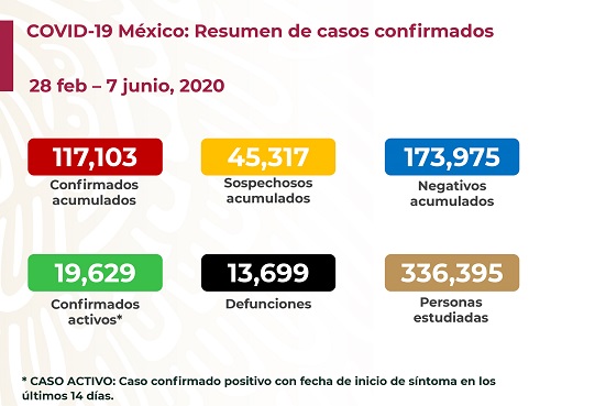 México suma hasta este domingo 117 mil 103 casos confirmados de COVID-19, de los cuales 19 mil 629 son activos, y 13 mil 699 defunciones, informó el director general de Epidemiología, José Luis Alomía Zegarra.