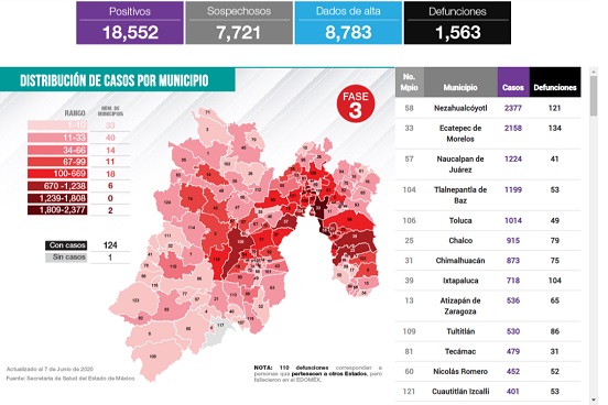 Edoméx suma 18,552 casos positivos Covid-19 y 1,563 defunciones con 8,783 dados de alta