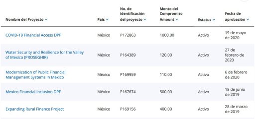 El 6 de febrero pasado se confirmó un nuevo crédito de 110 millones de dólares para la modernización de los sistemas públicos de gestión financiera; el 27 de febrero se obtuvo otro por 120 millones para seguridad del agua y resiliencia para el Valle de México.