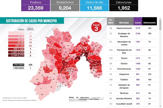 Edoméx suma 23,359 casos positivos de Covid-19 y 1,952 defunciones con 11,566 dados de alta