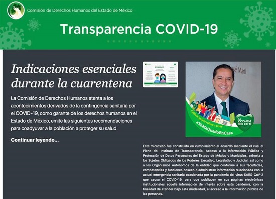 La Comisión de Derechos Humanos del Estado de México (Codhem) creó el Micrositio de Transparencia COVID-19 en su página oficial, con el objetivo de que la población en general se allegue de información verídica, confirmada y generada por instancias oficiales sobre la pandemia y ejerza su derecho humano de acceso a la información, informó la titular de la Unidad de Información, Planeación, Programación y Evaluación (UIPPE), Sheila Velázquez Londaiz.