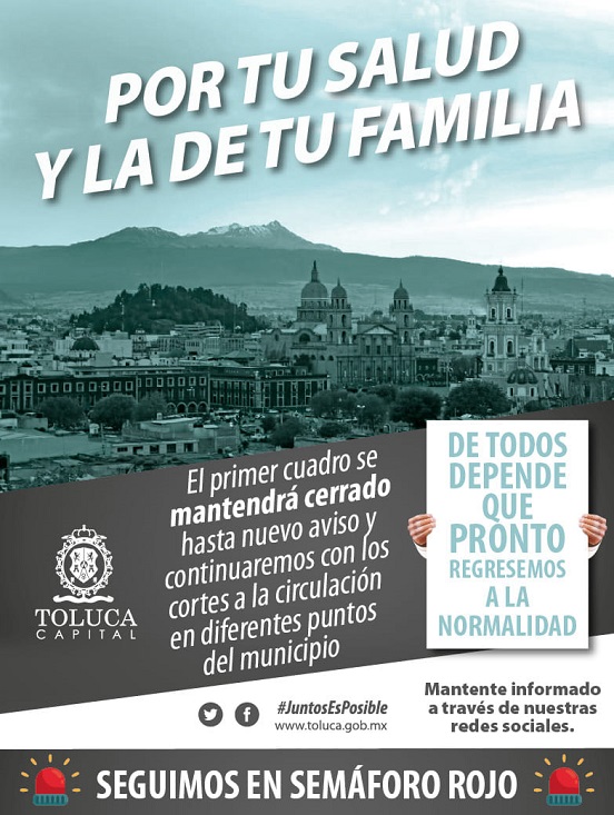 Como parte de las medidas para frenar los contagios y decesos por COVID-19 en Toluca, el primer cuadro permanecerá cerrado hasta nuevo aviso, por lo que se pide a la población utilizar vías alternas si requiere salir y, en caso contrario, se exhorta a quedarse en casa y observar las recomendaciones sanitarias.