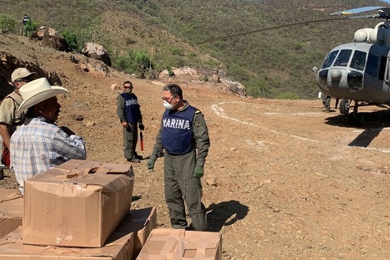 La institución indicó que a petición de la Secretaría del Bienestar se instaló el puente aéreo y para ello se emplearon dos helicópteros MI-17, y se asignó a personal de la Cuarta Zona Naval y de la Base Aeronaval de Guaymas, para el traslado y entrega de 325 cajas con productos alimenticios y material sanitizador como cubrebocas, gel antibacterial y guantes. Cabe destacar, que además, el personal del IMSS proporcionó consultas médicas a 60 personas.