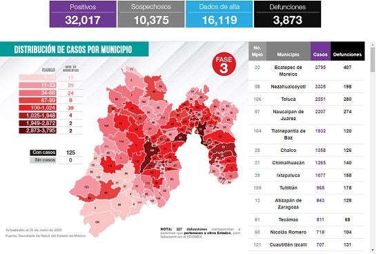 Edoméx suma 32,017 casos Covid-19 y 3,873 defunciones