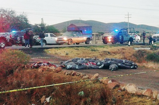 En un primer hallazgo, al amanecer de este viernes, sobre la autopista Zacatecas–Durango, kilómetro 67 más 550, a la altura del crucero con la comunidad de Ramón López Velarde, un comando armado que viajaba en varias camionetas dejó abandonados los cadáveres de 15 personas, acribilladas a tiros y envueltas en cobijas y amarradas con cinta y mecates.