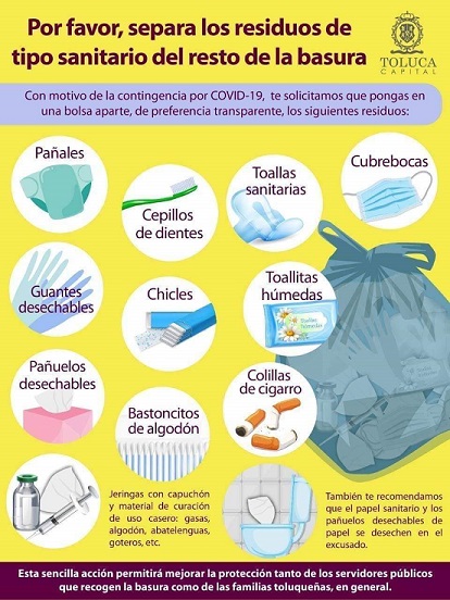 Debido a la declaración de emergencia sanitaria por COVID-19, el gobierno municipal de Toluca exhorta a las familias a separar los residuos sanitarios en sus hogares, con lo que se busca proteger a los servidores públicos que recogen la basura y a la población en general.