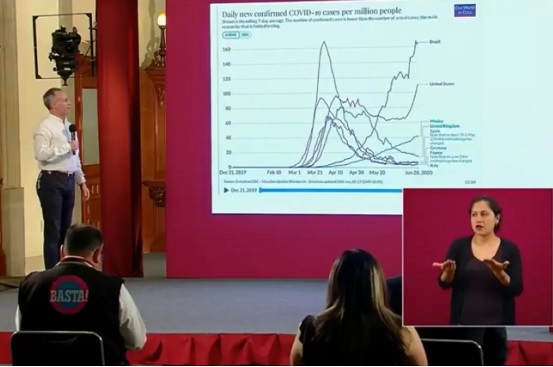 De acuerdo con dicha gráfica animada, México reporta una menor velocidad en aumento de contagios que Brasil y Estados Unidos.