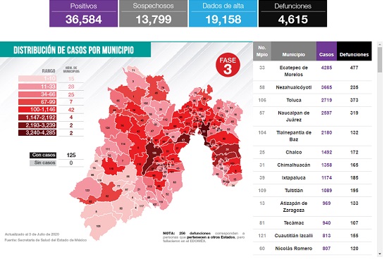 Edoméx suma 36,584 casos Covid-19 y 4,615 defunciones con 19,158 dados de alta