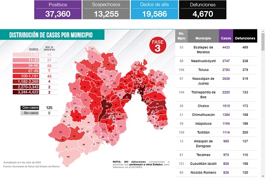 Edoméx suma 37,360 casos Covid-19 con 4,670 defunciones y 19,586 dados de alta