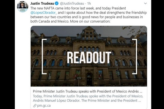 La oficina del primer ministro canadiense informó que coincidió con López Obrador en que la reciente entrada en vigor del nuevo acuerdo comercial para América del Norte fortalecería los profundos lazos económicos y la amistad de larga data entre Canadá y México, y promovería el desarrollo social y económico en ambos países”.